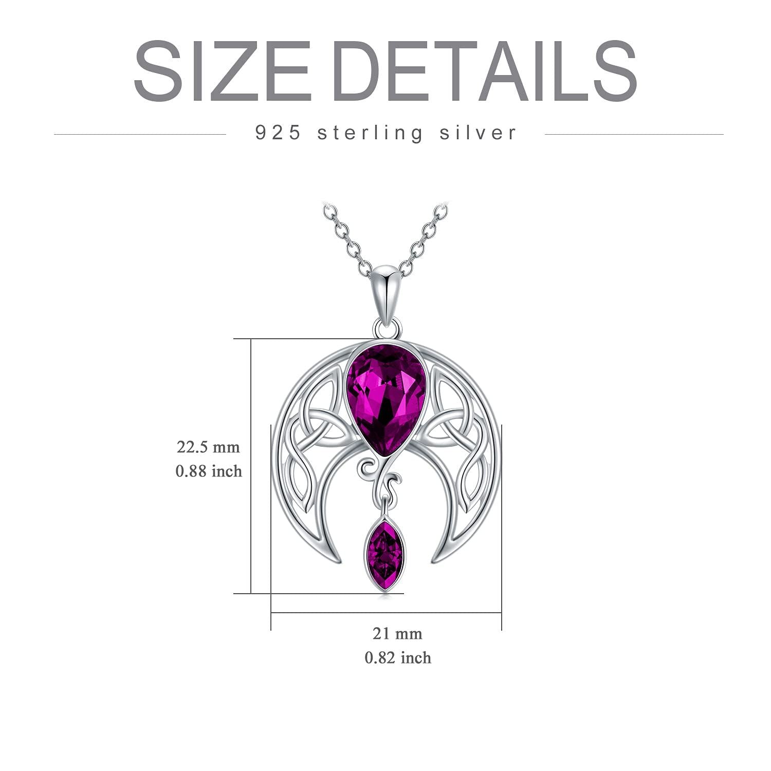 Hypoallergenic 925 silver Celtic moon pendant with Austrian simulated amethyst crystals